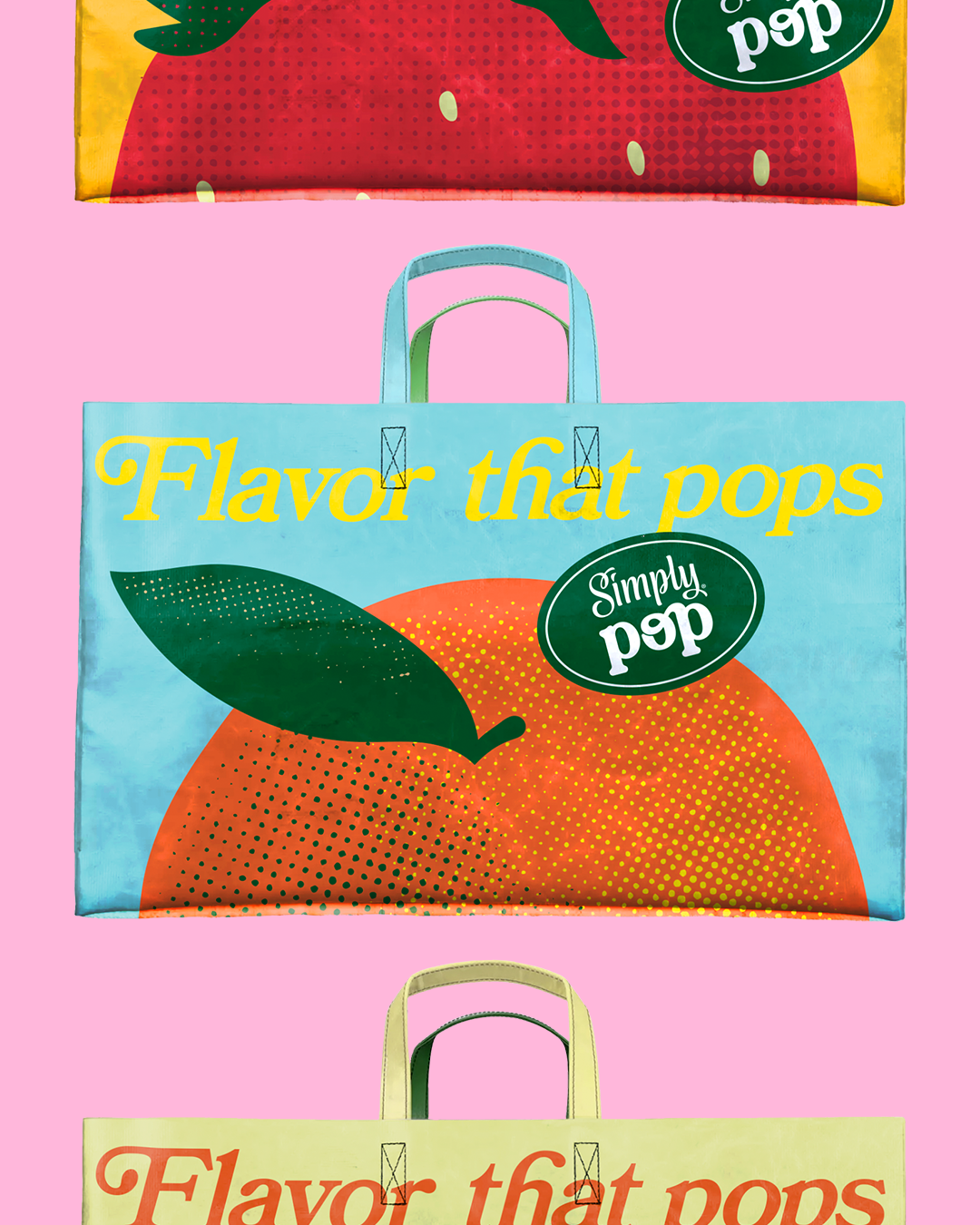 Para traduzir a leveza e a energia do Simply Pop, criamos uma linguagem visual que toma frutas como ponto de partida, mas rompe com os códigos óbvios de naturalidade. O sistema usa cores vibrantes, composições gráficas inusitadas e uma estética jovem e sensorial — mais próxima da cultura pop do que do universo tradicional do bem-estar.